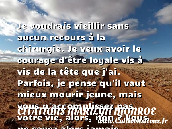 Je voudrais vieillir sans aucun recours à la chirurgie. Je veux avoir le courage d’être loyale vis à vis de la tête que j’ai. Parfois, je pense qu’il vaut mieux mourir jeune, mais vous n’accomplissez pas votre vie, alors, non ? Vous ne savez alors jamais vraiment qui vous êtes.