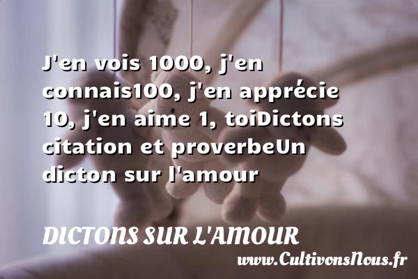 Evaluer cet article J’en vois 1000, j’en connais 100, j’en apprécie 10, j’en aime 1, toi Dictons citation et proverbe Un dicton sur l’amour A lire Je vous souhaite d’être PARTAGER