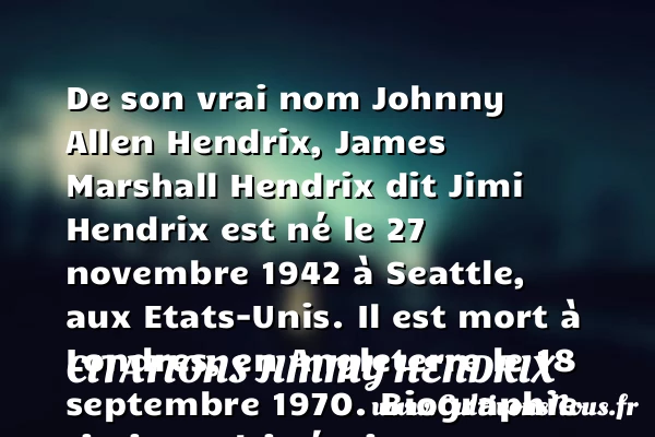 De son vrai nom Johnny Allen Hendrix, James Marshall Hendrix dit Jimi Hendrix est né le 27 novembre 1942 à Seattle, aux Etats-Unis. Il est mort à Londres, en Angleterre le 18 septembre 1970.
