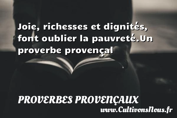Evaluer cet article Joie, richesses et dignités, font oublier la pauvreté. Un proverbe provençal A lire Il vaut mieux glisser du PARTAGER Tags: Proverbes richesse