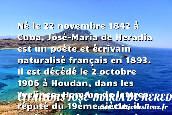 Né le 22 novembre 1842 à Cuba, José-Maria de Heradia est un poète et écrivain naturalisé français en 1893. Il est décédé le 2 octobre 1905 à Houdan, dans les Yvelines. Homme de lettres réputé du 19ème siècle, il est l’un des fondateurs du mouvement parnassien.