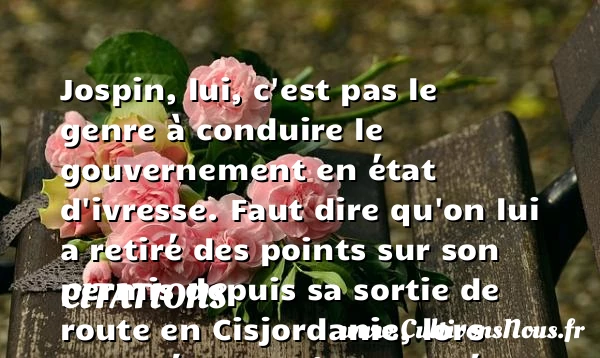 Jospin, lui, c’est pas le genre à conduire le gouvernement en état d’ivresse. Faut dire qu’on lui a retiré des points sur son permis depuis sa sortie de route en Cisjordanie, lors d’un dérapage incontrolé avec projection de graviers…