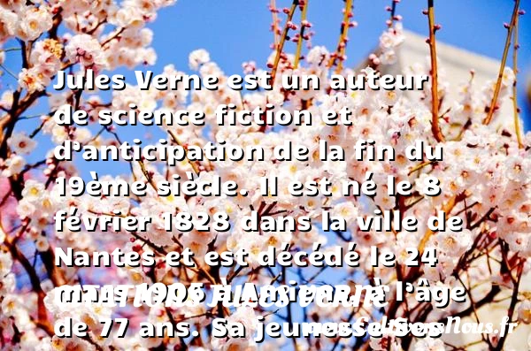 Jules Verne est un auteur de science fiction et d’anticipation de la fin du 19ème siècle. Il est né le 8 février 1828 dans la ville de Nantes et est décédé le 24 mars 1905 à Amiens, à l’âge de 77 ans.