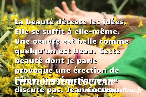 La beauté déteste les idées. Elle se suffit à elle-même. Une oeuvre est belle comme quelqu’un est beau. Cette beauté dont je parle provoque une érection de l’âme. Une érection ne se discute pas.