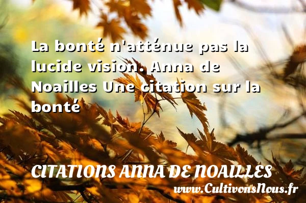 Evaluer cet article La bonté n’atténue pas la lucide vision. Anna de Noailles Une citation sur la bonté A lire Rien de plus haineux, PARTAGER Tags: citation bonté