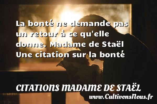 Evaluer cet article La bonté ne demande pas un retour à ce qu’elle donne. Madame de Staël Une citation sur la bonté A lire Si l'excessive bonté est PARTAGER Tags: citation bonté