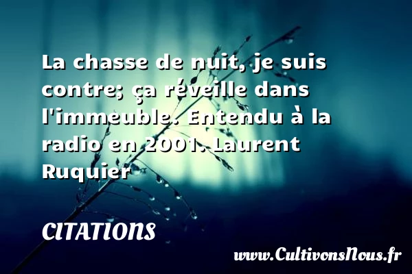 Evaluer cet article La chasse de nuit, je suis contre; ça réveille dans l’immeuble. Entendu à la radio en 2001. Laurent Ruquier A lire Il vaut mieux être un convoyeur vivant PARTAGER Tags: journaliste