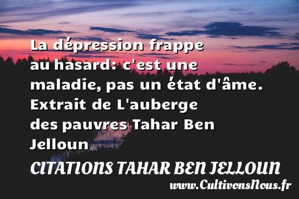 Evaluer cet article La dépression frappe au hasard: c’est une maladie, pas un état d’âme. Extrait de L’auberge des pauvres Tahar Ben Jelloun A lire Le timbre de la voix PARTAGER Tags: Citation hasard