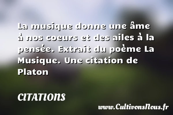 Evaluer cet article La musique donne une âme à nos coeurs et des ailes à la pensée. Extrait du poème La Musique. Une citation de Platon A lire La loi ne peut pas tenir compte PARTAGER Tags: AntiquitéCitation philosophiephilosophe