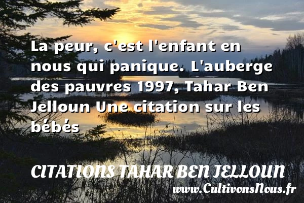 Evaluer cet article La peur, c’est l’enfant en nous qui panique. L’auberge des pauvres 1997, Tahar Ben Jelloun Une citation sur les bébés A lire Les blessures d'amitié sont PARTAGER Tags: Citation bébé