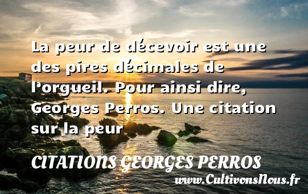 Evaluer cet article La peur de décevoir est une des pires décimales de l’orgueil. Pour ainsi dire, Georges Perros. Une citation sur la peur A lire Curiosité, abeille de l'ignorance. PARTAGER Tags: Citation peur