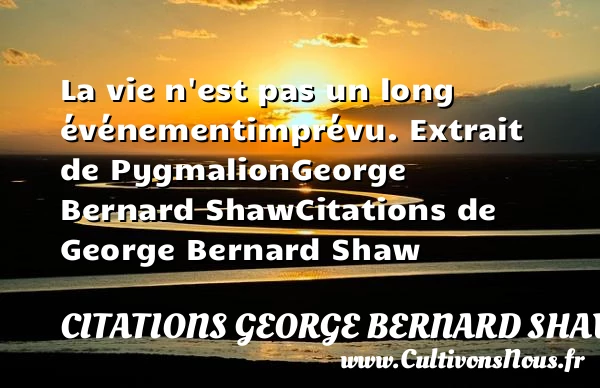 Evaluer cet article La vie n’est pas un long événement imprévu. Extrait de Pygmalion George Bernard Shaw Citations de George Bernard Shaw A lire Le martyre est la seule façon pour PARTAGER