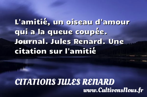 Evaluer cet article L’amitié, un oiseau d’amour qui a la queue coupée. Journal. Jules Renard. Une citation sur l’amitié A lire L'amitié du méchant PARTAGER Tags: Citation Amitié