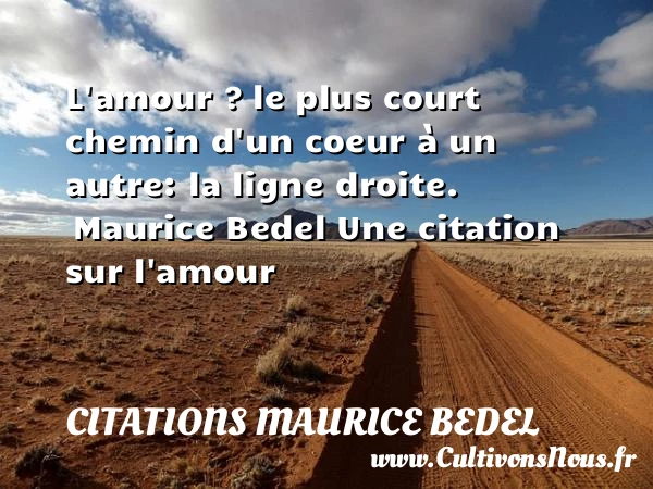 Evaluer cet article L’amour ? le plus court chemin d’un coeur à un autre: la ligne droite. Maurice Bedel Une citation sur l’amour A lire Il n'y a rien au ciel et sur la terre PARTAGER Tags: Citations amour