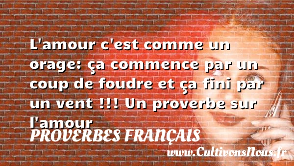 Evaluer cet article L’amour c’est comme un orage: ça commence par un coup de foudre et ça fini par un vent !!! Un proverbe sur l’amour A lire Il n'y a pas de PARTAGER Tags: Proverbe amour