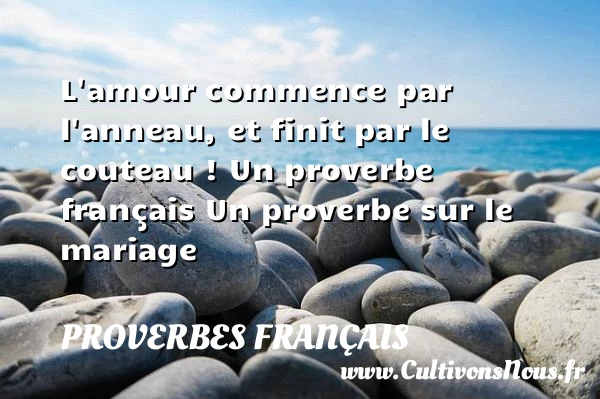 Evaluer cet article L’amour commence par l’anneau, et finit par le couteau ! Un proverbe français Un proverbe sur le mariage A lire Boire et manger, coucher PARTAGER Tags: Proverbes mariage