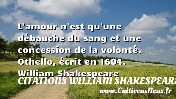 Evaluer cet article L’amour n’est qu’une débauche du sang et une concession de la volonté. Othello, écrit en 1604. William Shakespeare A lire Quand nous voyons un supérieur PARTAGER Tags: Citation volonté