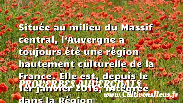Située au milieu du Massif central, l’Auvergne a toujours été une région hautement culturelle de la France. Elle est, depuis le 1er janvier 2016, intégrée dans la Région Auvergne-Rhône-Alpes selon la loi relative à la délimitation des régions. Sa plus grande ville est Clermont-Ferrand qui abrite plus du quart de la population d’Auvergne.