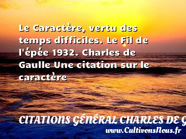 Evaluer cet article Le Caractère, vertu des temps difficiles. Le Fil de l’épée 1932. Charles de Gaulle Une citation sur le caractère A lire Quand on a du caractère PARTAGER Tags: Citation caractère