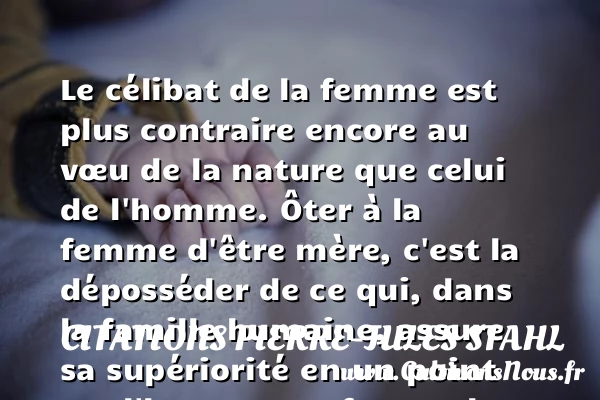 Le célibat de la femme est plus contraire encore au vœu de la nature que celui de l’homme. Ôter à la femme d’être mère, c’est la déposséder de ce qui, dans la famille humaine, assure sa supériorité en un point sur l’homme. La femme la plus tombée a cette ressource de pouvoir être une mère sublime.