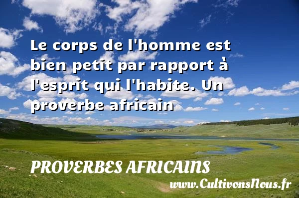 Evaluer cet article Le corps de l’homme est bien petit par rapport à l’esprit qui l’habite. Un proverbe africain A lire La beauté de l'homme PARTAGER Tags: Proverbes esprit
