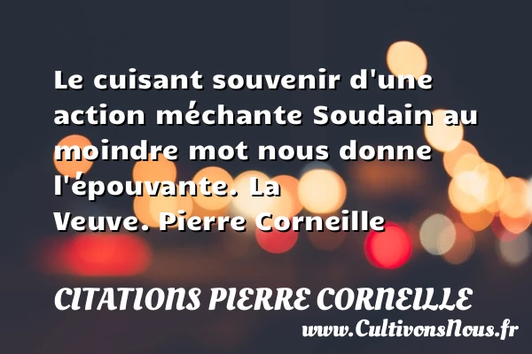 Evaluer cet article Le cuisant souvenir d’une action méchante Soudain au moindre mot nous donne l’épouvante. La Veuve. Pierre Corneille A lire Si l'amour quelquefois PARTAGER Tags: Citation souvenir