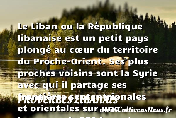 Le Liban ou la République libanaise est un petit pays plongé au cœur du territoire du Proche-Orient. Ses plus proches voisins sont la Syrie avec qui il partage ses frontières septentrionales et orientales sur une longueur de 376 km, et l’Israël qui se localise au-delà de ses frontières méridionales. Le pays dispose d’un littoral occidental qui donne sur la partie orientale de la mer Méditerranée appelée le bassin levantin. Son territoire a une petite superficie de 10 452 km2, mais abrite une population de 5 882 500 personnes en 2014. Le pays est ainsi soumis à une densité très importante de 563 hab/km2.