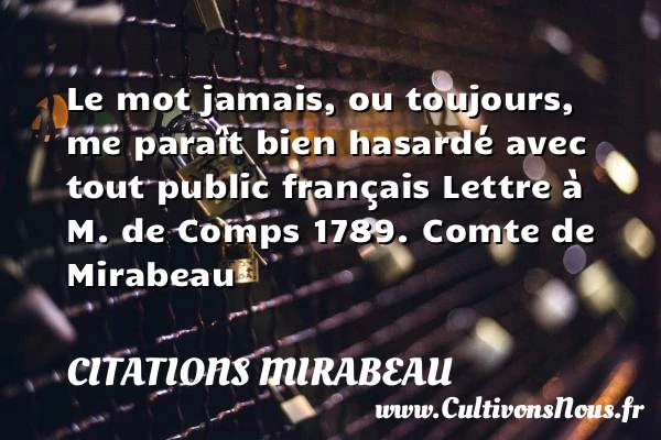 Evaluer cet article Le mot jamais, ou toujours, me paraît bien hasardé avec tout public français Lettre à M. de Comps 1789. Comte de Mirabeau A lire Nous n'escobarderons point sur PARTAGER Tags: Citation hasard