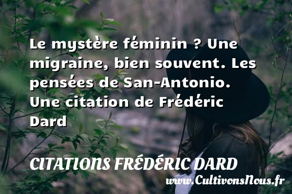 Evaluer cet article Le mystère féminin ? Une migraine, bien souvent. Les pensées de San-Antonio. Une citation de Frédéric Dard A lire Une femme de mystère est PARTAGER Tags: Citation mystère