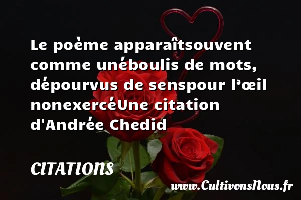 Evaluer cet article Le poème apparaît souvent comme un éboulis de mots, dépourvus de sens pour l’œil non exercé Une citation d’Andrée Chedid A lire Il n'y a pas de problèmes; il n'y a PARTAGER