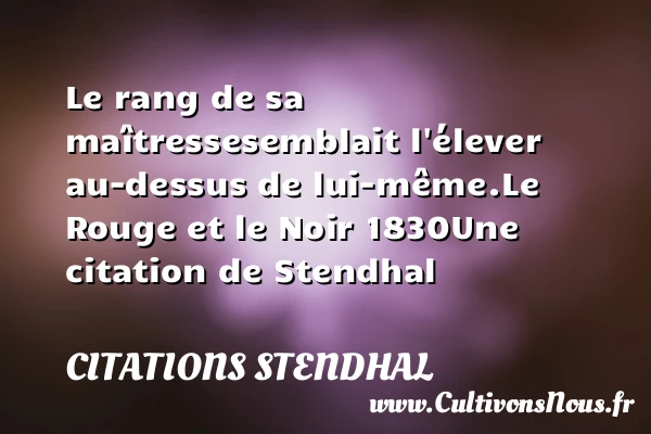 Evaluer cet article Le rang de sa maîtresse semblait l’élever au-dessus de lui-même. Le Rouge et le Noir 1830 Une citation de Stendhal A lire C'est en Italie et au XVIIe PARTAGER