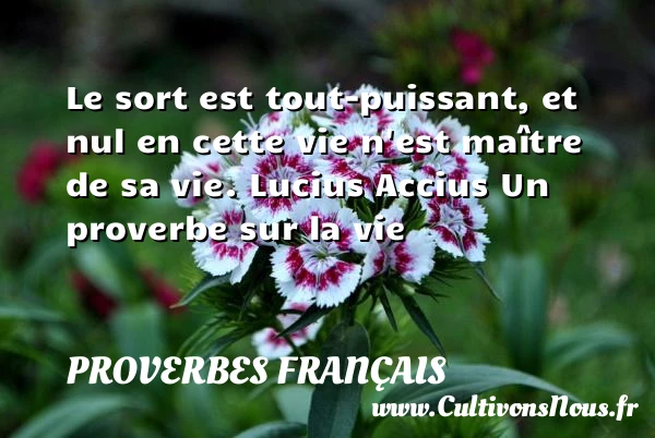 Evaluer cet article Le sort est tout-puissant, et nul en cette vie n’est maître de sa vie. Lucius Accius Un proverbe sur la vie A lire N'ayez d'intolérance que PARTAGER Tags: Proverbes vie