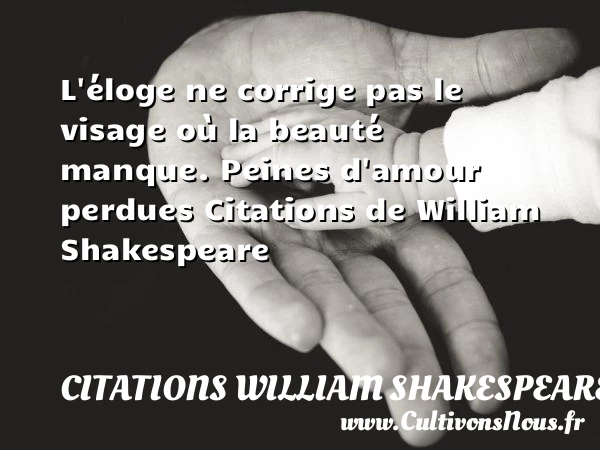 Evaluer cet article L’éloge ne corrige pas le visage où la beauté manque. Peines d’amour perdues Citations de William Shakespeare A lire Je ne te connais pas, vieil homme. PARTAGER Tags: Citation visage