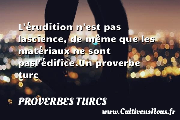 Evaluer cet article L’érudition n’est pas la science, de même que les matériaux ne sont pas l’édifice. Un proverbe turc A lire Si le prince a l'épée PARTAGER Tags: Proverbe science