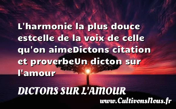 Evaluer cet article L’harmonie la plus douce est celle de la voix de celle qu’on aime Dictons citation et proverbe Un dicton sur l’amour A lire L’amour est la poésie des PARTAGER