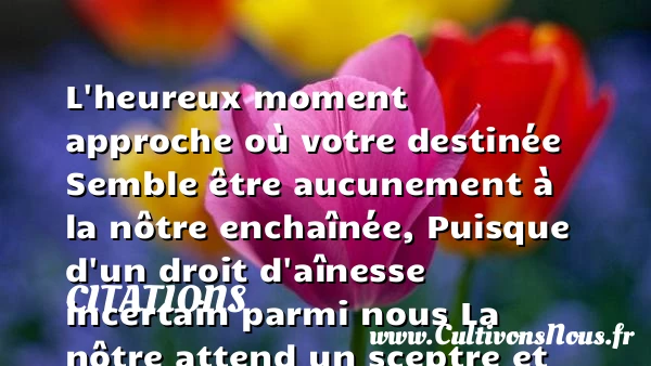 L’heureux moment approche où votre destinée Semble être aucunement à la nôtre enchaînée, Puisque d’un droit d’aînesse incertain parmi nous La nôtre attend un sceptre et la vôtre un époux.