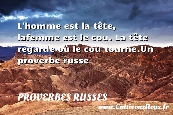 Evaluer cet article L’homme est la tête, la femme est le cou. La tête regarde où le cou tourne. Un proverbe russe A lire En main d'autrui le morceau PARTAGER