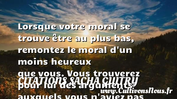 Lorsque votre moral se trouve être au plus bas, remontez le moral d’un moins heureux que vous. Vous trouverez pour lui des arguments auxquels vous n’aviez pas songé pour vous et dont vous ferez votre profit.