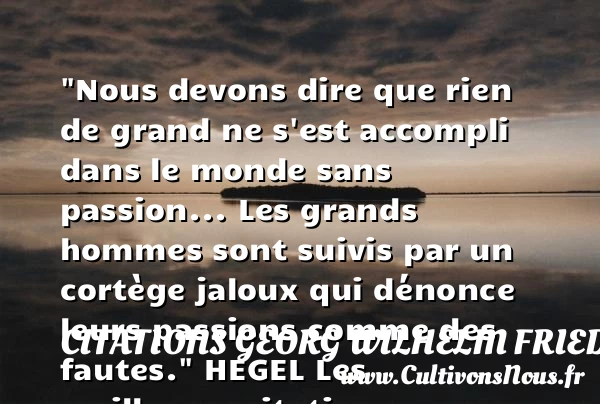 “Nous devons dire que rien de grand ne s’est accompli dans le monde sans passion… Les grands hommes sont suivis par un cortège jaloux qui dénonce leurs passions comme des fautes.”
