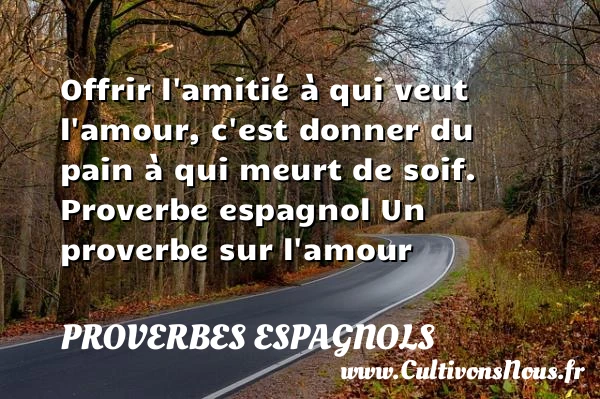 Evaluer cet article Offrir l’amitié à qui veut l’amour, c’est donner du pain à qui meurt de soif. Proverbe espagnol Un proverbe sur l’amour A lire Le vent change chaque jour, la femme chaque PARTAGER Tags: Proverbe amour