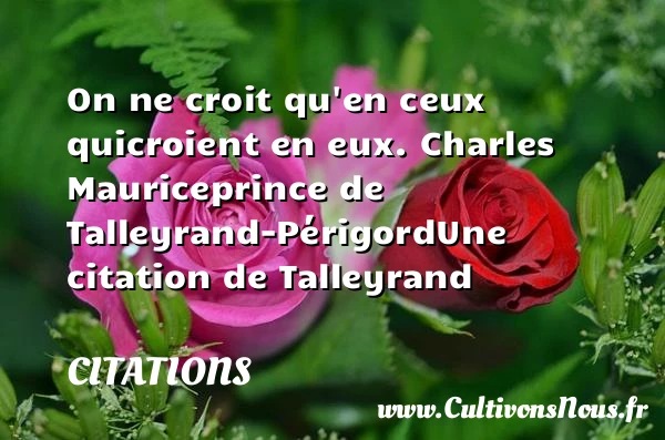 Evaluer cet article On ne croit qu’en ceux qui croient en eux. Charles Maurice prince de Talleyrand-Périgord Une citation de Talleyrand A lire Il y a un proverbe chinois qui ne PARTAGER