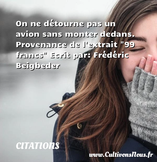 Evaluer cet article On ne détourne pas un avion sans monter dedans. Provenance de l’extrait “99 francs” Ecrit par: Frédéric Beigbeder A lire Les cosmonautes russes, quand ils PARTAGER