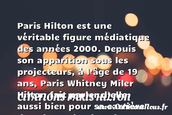 Paris Hilton est une véritable figure médiatique des années 2000. Depuis son apparition sous les projecteurs, à l’âge de 19 ans, Paris Whitney Miler Hilton fait parler d’elle, aussi bien pour sa carrière dans la mode, dans la chanson et dans le cinéma que pour son nom, venant de la longue lignée des propriétaires des hôtels Hilton.