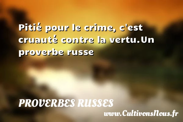 Evaluer cet article Pitié pour le crime, c’est cruauté contre la vertu. Un proverbe russe A lire Le pourceau dit au cheval: PARTAGER Tags: Proverbes vertu
