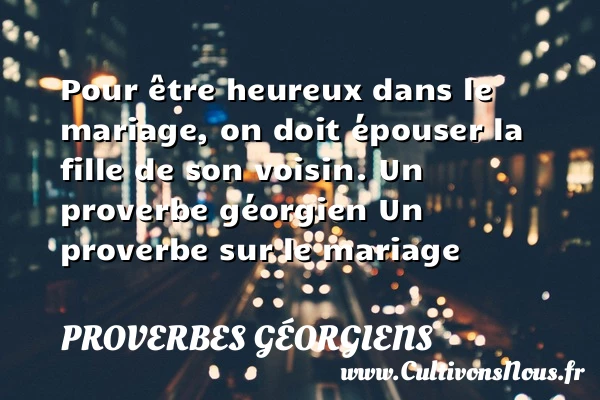 Evaluer cet article Pour être heureux dans le mariage, on doit épouser la fille de son voisin. Un proverbe géorgien Un proverbe sur le mariage A lire Dieu est la consolation du pauvre. PARTAGER Tags: Proverbes mariage