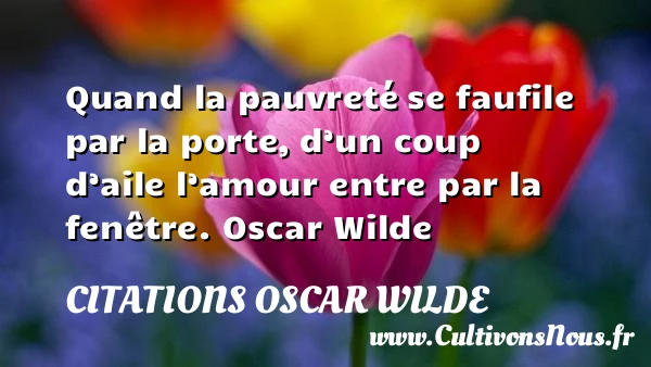 Evaluer cet article Quand la pauvreté se faufile par la porte, d’un coup d’aile l’amour entre par la fenêtre. Oscar Wilde A lire Dans le domaine de la création, la PARTAGER Tags: Citation pauvreté