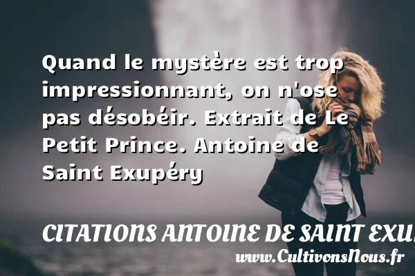 Evaluer cet article Quand le mystère est trop impressionnant, on n’ose pas désobéir. Extrait de Le Petit Prince. Antoine de Saint Exupéry A lire Le véritable enseignement n'est PARTAGER Tags: Citation mystère