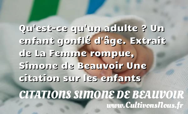 Evaluer cet article Qu’est-ce qu’un adulte ? Un enfant gonflé d’âge. Extrait de La Femme rompue, Simone de Beauvoir Une citation sur les enfants A lire Tout enfant qui naît est un dieu PARTAGER Tags: Citation enfant