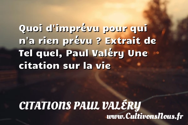 Evaluer cet article Quoi d’imprévu pour qui n’a rien prévu ? Extrait de Tel quel, Paul Valéry Une citation sur la vie A lire Le goût PARTAGER Tags: Citation sur la vie