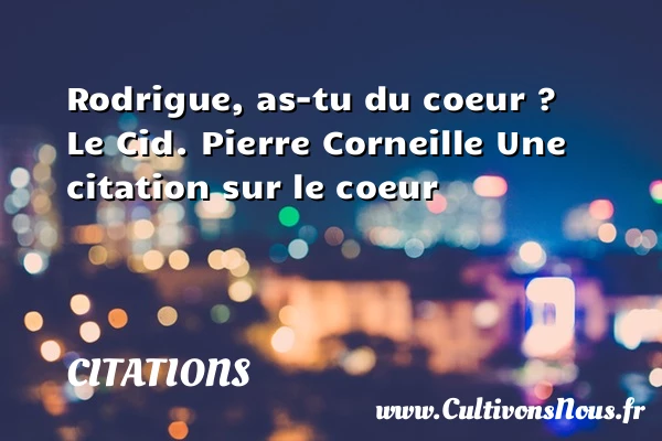 Evaluer cet article Rodrigue, as-tu du coeur ? Le Cid. Pierre Corneille Une citation sur le coeur A lire Tout ce que le coeur désire peut toujours se réduire à la figure PARTAGER Tags: Citations coeur